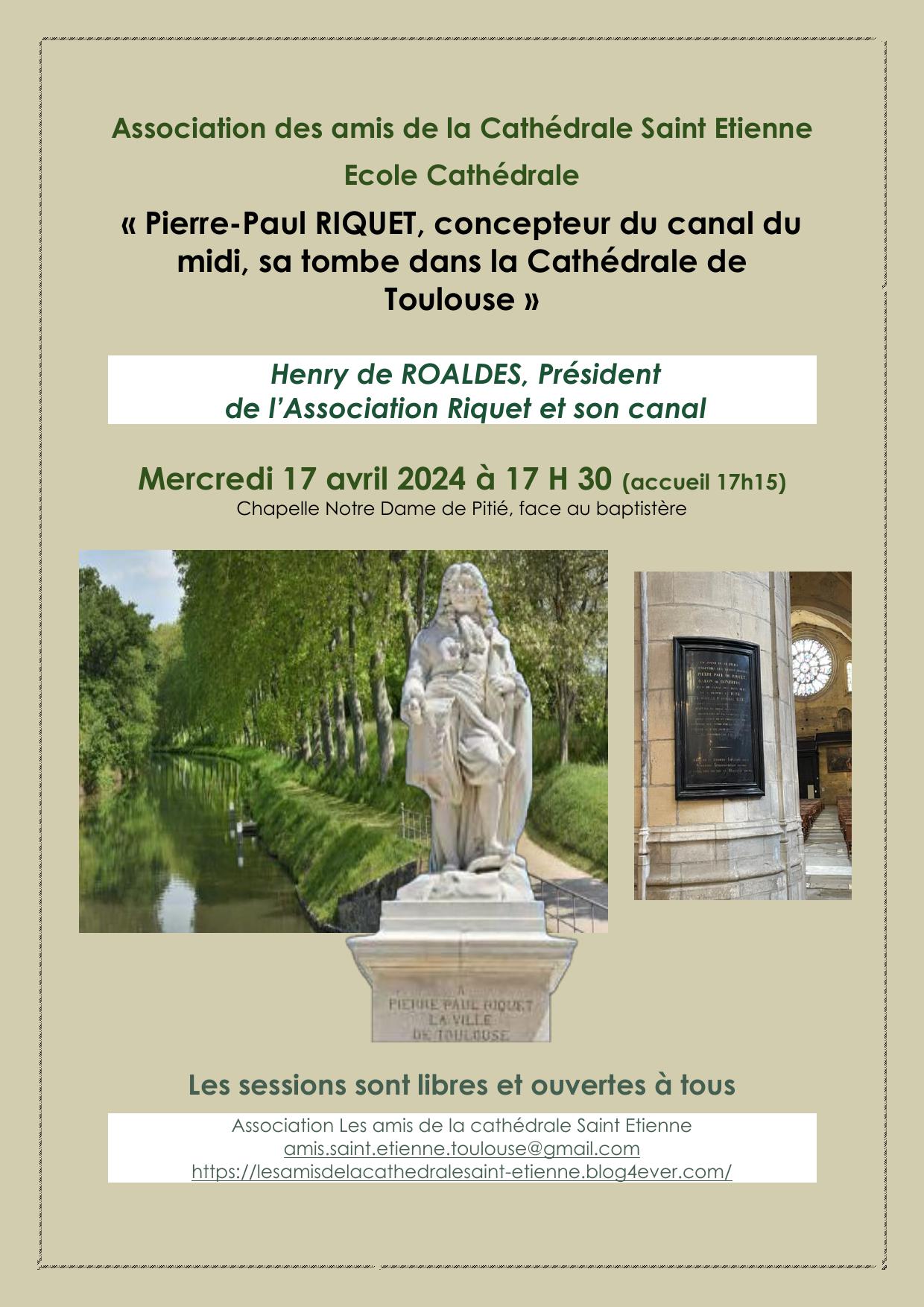 Henry de ROALDES, Président de l’Association Riquet et son canal, nous fera partager la vie et l’œuvre du visionnaire concepteur et bâtisseur du canal du midi, Pierre-Paul Riquet, Baron de Bonrepos, enterré dans la cathédrale.